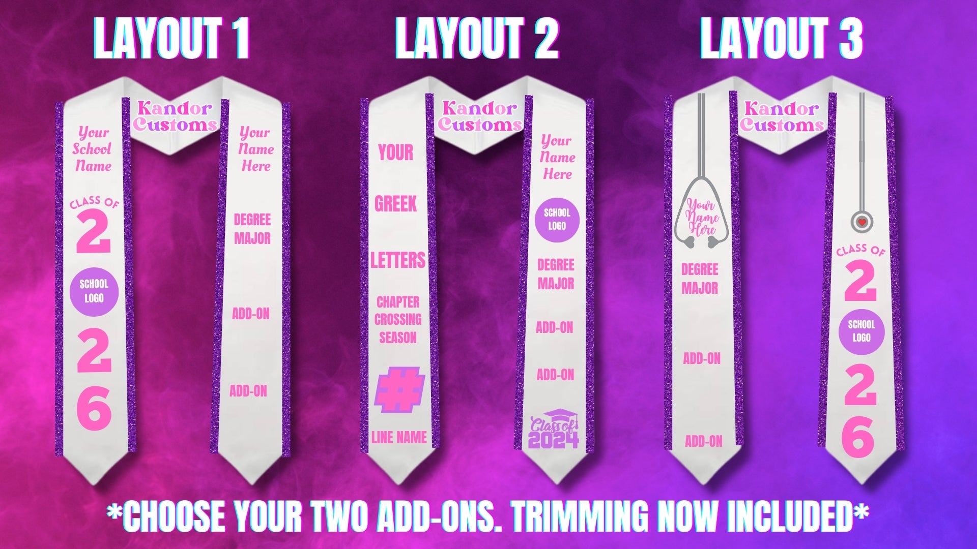 These pre-designed stoles take out the guesswork, just choose your layout, fill out the form, and we’ll handle the rest. Each stole is paid in full at checkout, no deposit required.